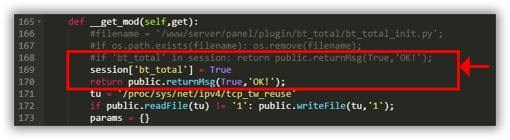 使用Ctrl+F搜索并找到if 'bt_total' in session: return public.returnMsg(True,'OK!');这段代码